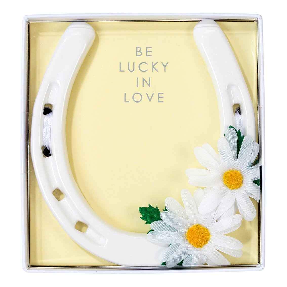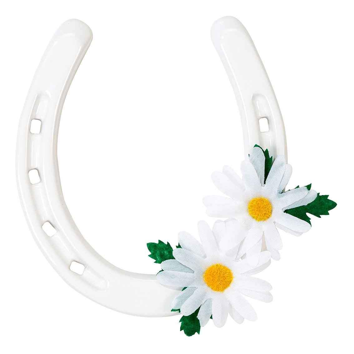 White lucky horseshoe wedding gift with daisy flower trim. Keep with tradition by gifting the bride a ceramic horseshoe hanging decoration to bring good luck to the newlyweds. The perfect wedding day keepsake for years to come and a traditional wedding gift.