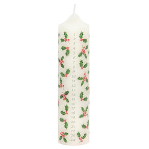 A traditional twist on an advent calendar, this statement pillar candle is a beautiful addition to your festively decorated home. Count down the days to Christmas with the dates of Advent printed alongside a traditional holly leaf pattern. Light the candle each day and discover the joy of this pretty and purposeful table decoration. Placed in a Christmas wreath of fresh holly or set on a mantlepiece and lit after dinner, this candle is a beautiful way for the whole family to enjoy the lead up to Christmas Day.
