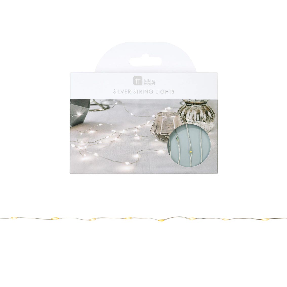 Delicate and modern, these silver wire LED string lights add a soft glow to any setting. Their fine metallic wire disappears into the background, letting the warm white bulbs take centre stage. Perfect for draping across a table, winding around glassware or styling along a mantel, they bring an elegant sparkle to your décor.
