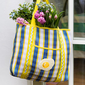 Yellow and blue stripes set the scene, with playful ric rac trim and an embroidered fried egg for a light-hearted finishing touch.