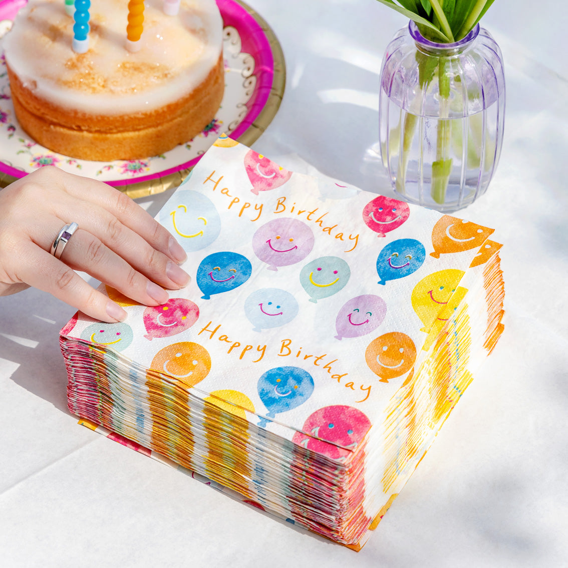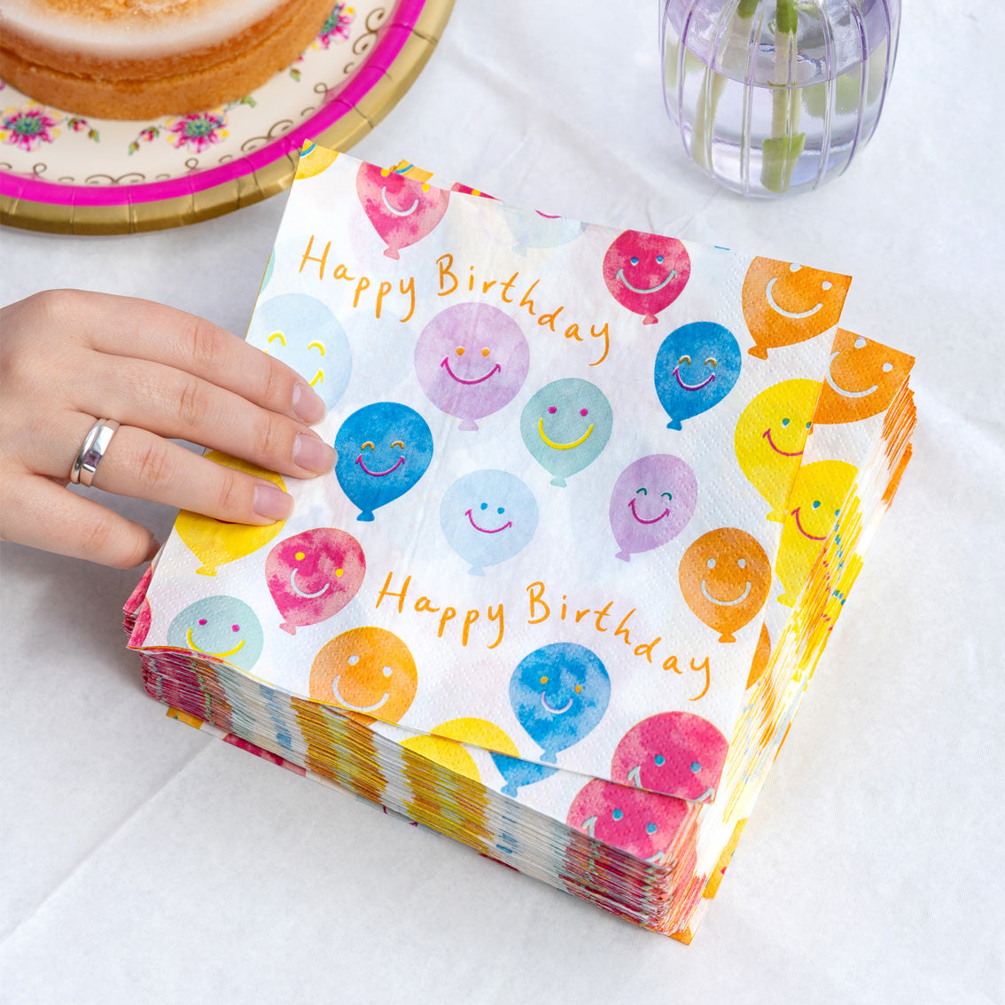 Bring smiles to the table with these bright and cheery Happy Face napkins. Featuring colourful smiley balloon prints and playful ‘Happy Birthday’ lettering, they add instant fun to any celebration. Made in Europe from FSC-certified paper, they’re soft, strong and fully home compostable – so you can party in style while being kind to the planet.
