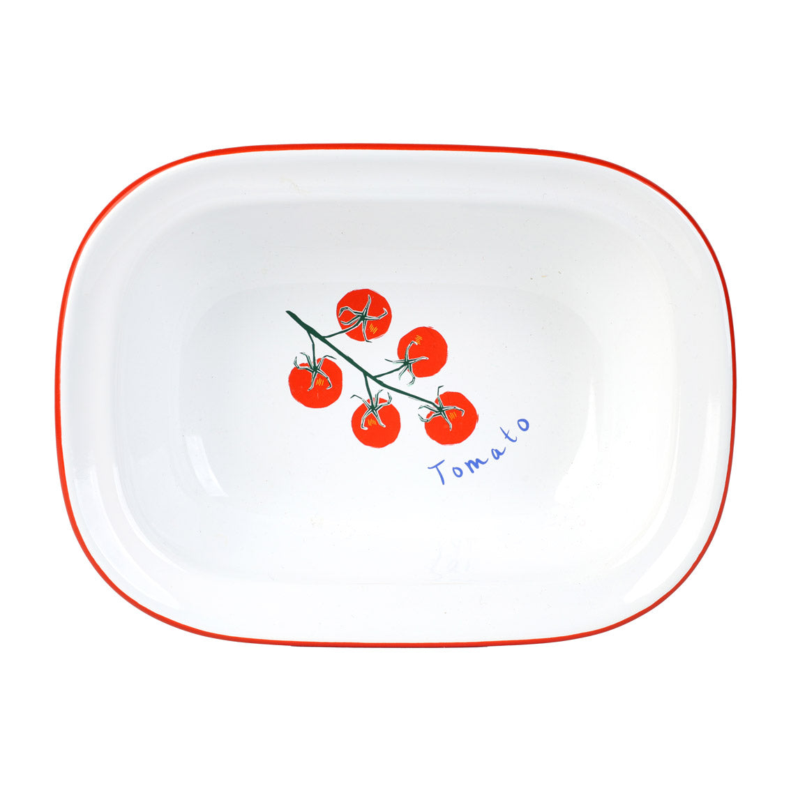 A soft green outer gives it a calm, classic feel. Inside, a stylish design of bright red tomatoes sits against clean white enamel, finished with a fine red rim and handwritten-style detail. Graphic but relaxed. Made to mix in when the table starts to fill.